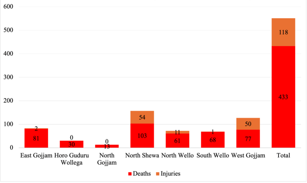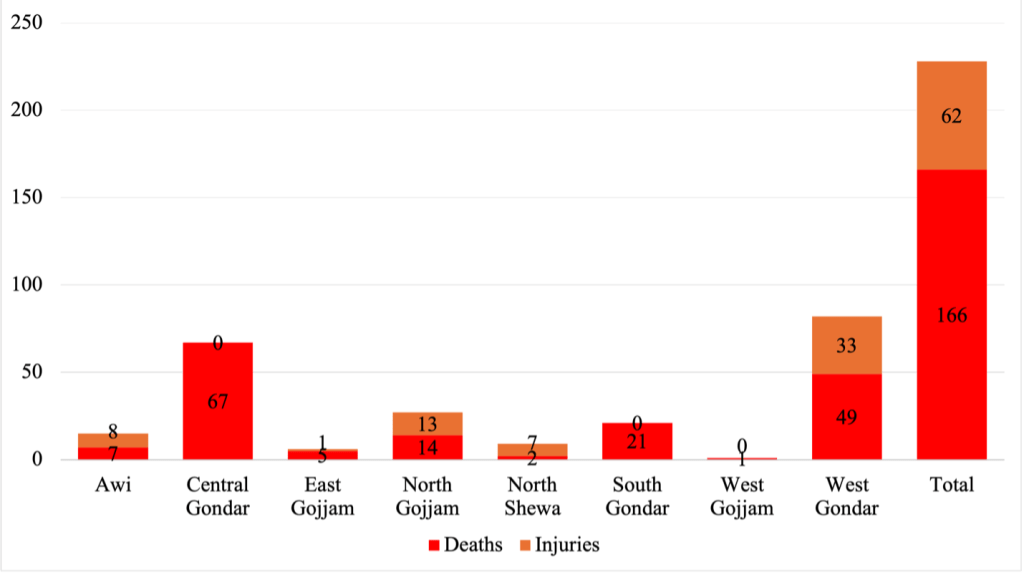 Figure 3: Drone & Airstrike Casualties in Amhara Region by Administrative Zone (September 25 – October 19, 2024)