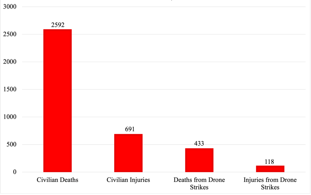 Furthermore, as illustrated in Figure 2, the 53 confirmed drone strikes occurred in 35 separate incidents and resulted in 551 civilian casualties including 433 civilian deaths and 118 injuries. The drone strikes disproportionately targeted civilians in marketplaces, schools, clinics, and ambulances—which is against International Humanitarian Law.
