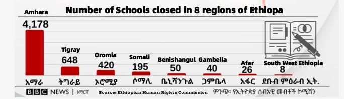 As schools have become targets of conflict and drone strikes, there has been a dramatic increase in school closures—with the vast majority of closures being in the Amhara region (Figure 4). Additionally, schools are being repurposed by the Abiy regime for other activities, including military camps.