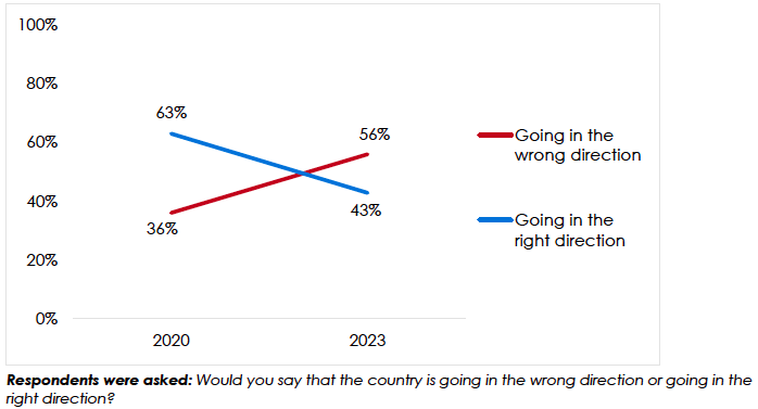 A majority of adult citizens, 56%, say Ethiopia is heading in the wrong direction, up by 20% since 2020 (36%) (Figure 1). A direct consequence of a mismanaged economy, inability to meet basic necessities, and lack of peace and security. Regarding the most important problems the government must address, the top 5 concerns of citizens are: 1) the economy; 2) basic needs (water supply, infrastructure/roads, electricity); 3) civil war/political violence; 4) unemployment; and 5) crime and security. All clear indications of poor governance.