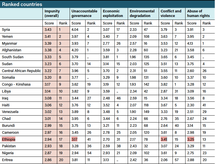 Ethiopia’s overall score of 2.94 out of 5, ranks 17th worst out of 170 countries ranked, or 153rd out of 170 (Figure 1). Ethiopia’s score also falls below the average score of 2.02 out of 5 – with the country’s score declining from last year. Additionally, levels of justice and accountability have consistently eroded for the past five years, according to the the Atlas of Impunity report.