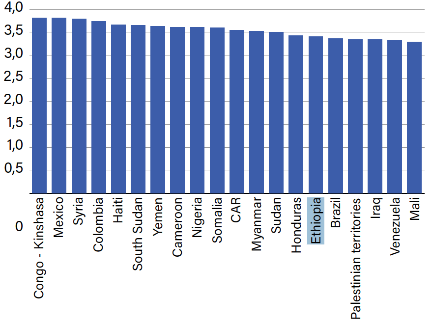 In particular, the ongoing conflicts in Amhara and Oromia regions continue to elevate Ethiopia’s conflict and violence score, which is the country’s worst performing dimension — scoring 3.41 out of 5 (Figure 2).