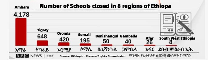 The Abiy regime’s war on Amhara — home to 23 million people — has led to the closure of 4,178 schools, while only 2.3 million students are enrolled in school out of 7 million school-aged children in the Amhara region. Furthermore, according to Doctors Without Borders, “the ongoing conflict has severely affected the region’s already fragile healthcare system, with many facilities facing shortages of essential medicines”.