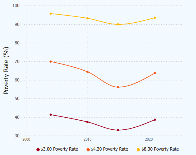 For instance, in 2021, 86% of rural adults had not completed primary education, while nearly half of rural households had at least one stunted child, and over a quarter reported having a severely stunted child.