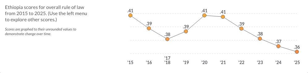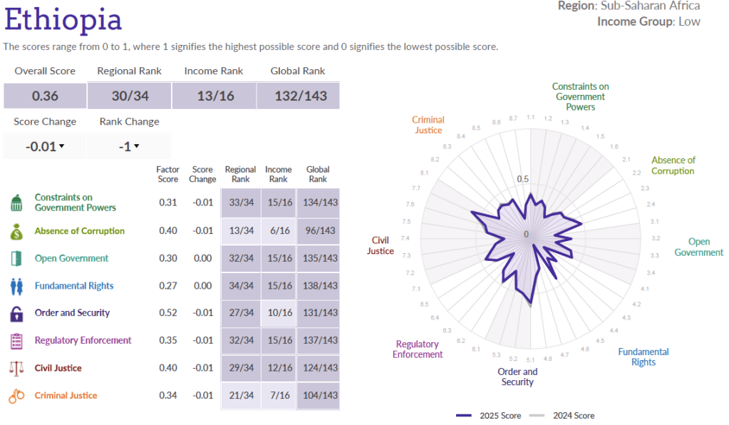 As the Rule of Law Index 2025 reflects, the combination of armed conflict, violence against civilians, gross human rights violations, and total disregard for the rule of law continues to adversely effect governance, socioeconomic growth and development in Ethiopia.