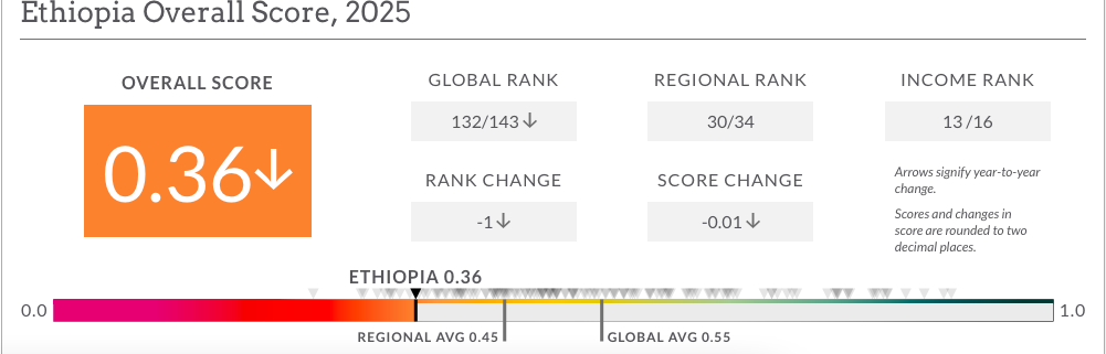 Notably, Ethiopia performs particularly poorly in several factors, including: Fundamental Rights (138/143); Regulatory Enforcement (137/143); Open Government (135/143); Constraints on Government (134/143); and Order and Security (131/143).